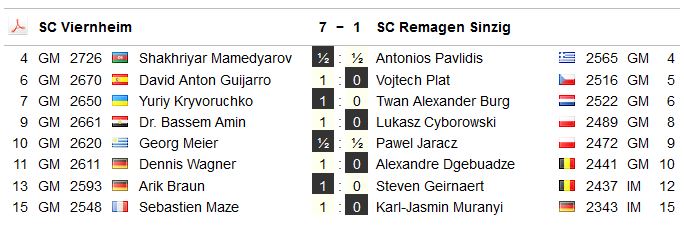 Wie so häufig waren es die unteren Bretter des Titelverteidigers, die den Unterschied ausmachen, während die oberen nichts anbrennen lassen. Wie am Vortag zeichnete sich schnell ab, dass Arkadij Naiditsch und Sergei Movsesian am siebten und achten Brett voll punkten würden. Wenig später kam am sechsten noch ein Zähler von Michael Adams dazu, damit stand es 4,5:1,5, und das Match war entschieden. Der FC Bayern des Schachs bleibt nach dem Sieg über den richtigen FC Bayern auf Tuchfühlung mit Viernheim – und gleichauf mit den hartnäckigen Kirchweyhern.